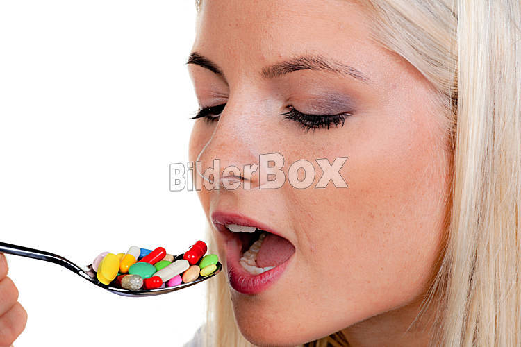 Beschreibung Junge Frau mit vielen Tabletten auf Löffel: