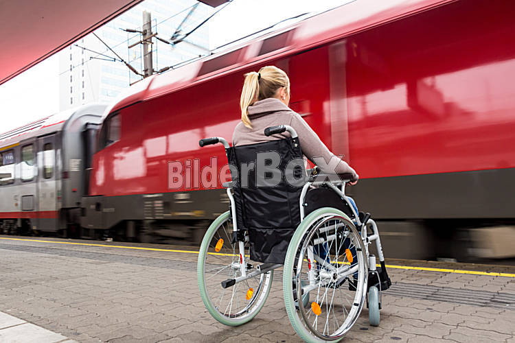 Beschreibung Eine junge Frau sitzt in einem Rollstuhl auf einem Bahnhof