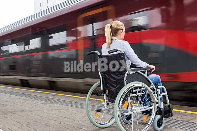 Beschreibung Eine junge Frau sitzt in einem Rollstuhl auf einem Bahnhof
