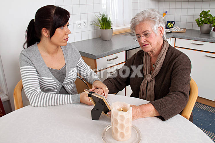 Beschreibung Eine junge Frau tröstet Witwe nach Todesfall. Trauerbegleitung.