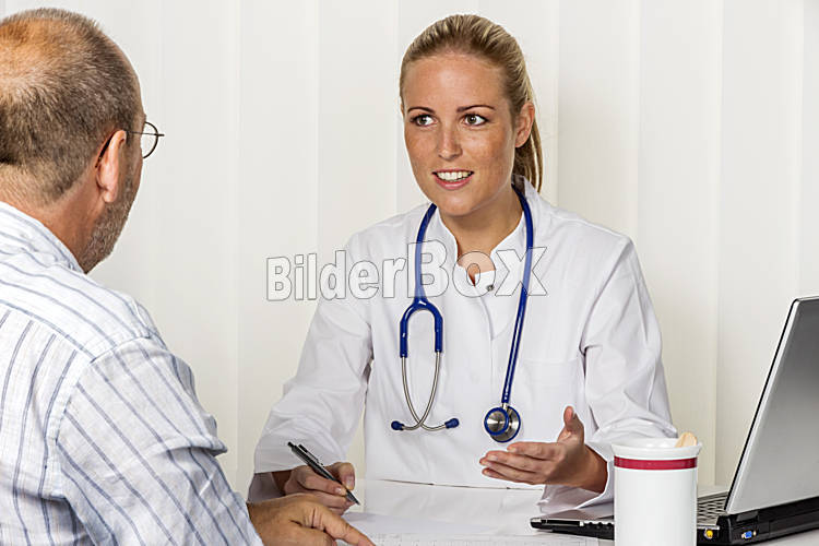 Beschreibung Patient und Arzt im Gespräch bei der Beratung in der Arztpraxis. Vertrauen in den Hausarzt.