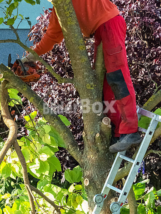 Beschreibung Ein Gärtner schneidet einen Baum um. Arbeiten im Garten.