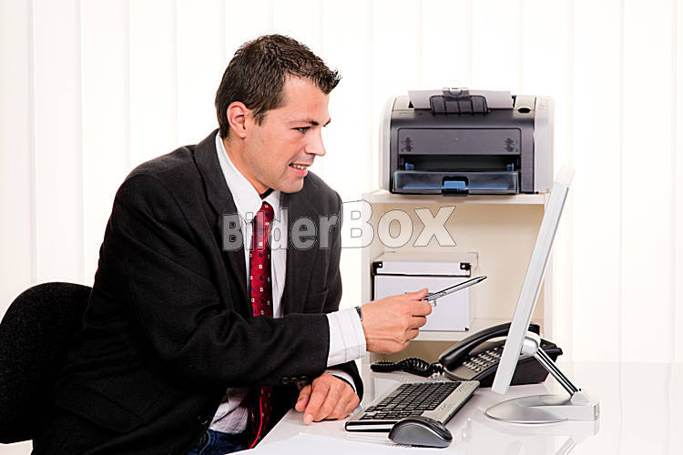 Beschreibung Junger Geschäftsmann im Büro mit Computer
