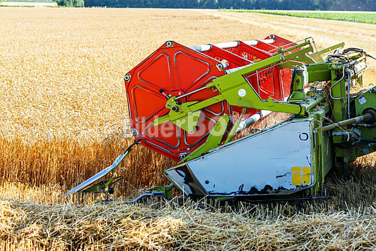 Beschreibung Ein Getreidefeld mit Weizen bei der Ernte. Ein Mähdrescher bei der Arbeit.