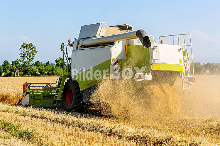 Beschreibung Ein Getreidefeld mit Weizen bei der Ernte. Ein Mähdrescher bei der Arbeit.