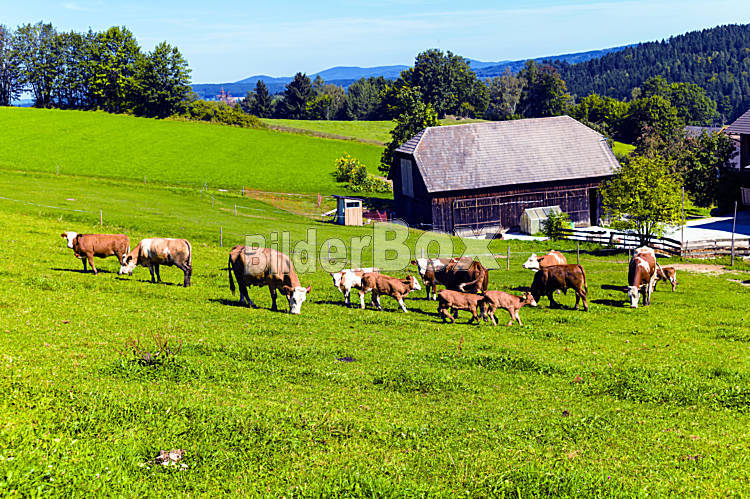Beschreibung Viele glückliche Kühe mit ihren Kälbern auf einer Weide eines Bauern. Tierhaltung in der Landwirtschaft