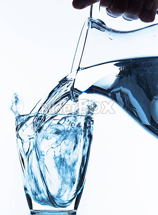 Beschreibung Reines Wasser wird in ein Wasserglas aus einem Krug eingeleert. Frisches Trinkwasser