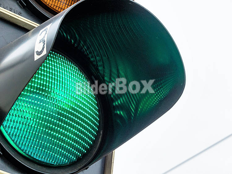 Beschreibung Bei einer Verkehrsampel leuchtet grünes Licht. Symbolfoto für Start und Erfolg.