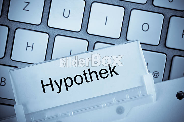 Beschreibung Die Mappe eines Hängeregisters vor einer Computertastatur zum Thema Hypothek