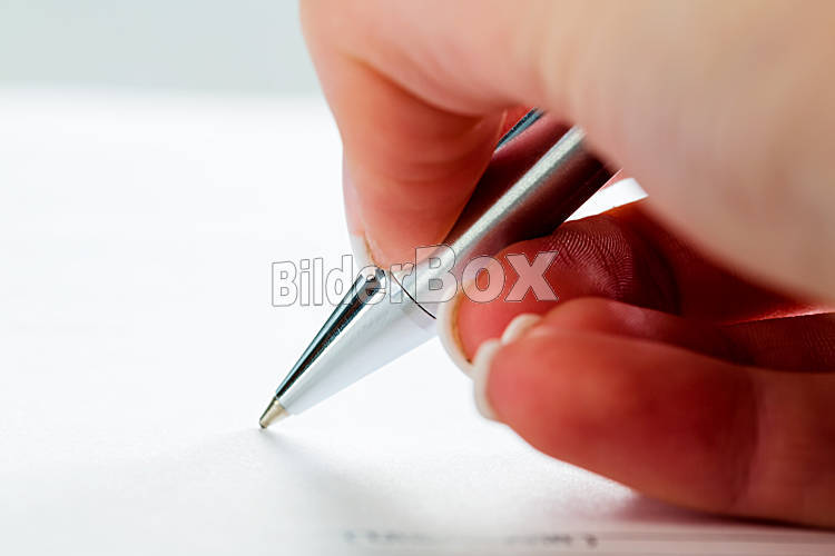 Beschreibung Eine Hand mit einer Füllfeder bei der Untrerschrift unter einem Vertrag oder Testament.