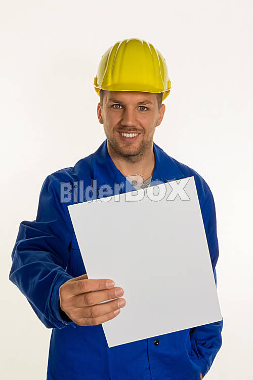 Beschreibung Arbeiter in einem Gewerbebetrieb mit Helm vor weißem Hintergrund