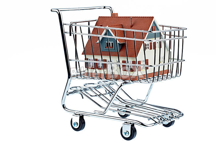 Beschreibung Ein Modell eines Hauses in einem Einkaufswagen. Symbolfoto für Hauskauf.