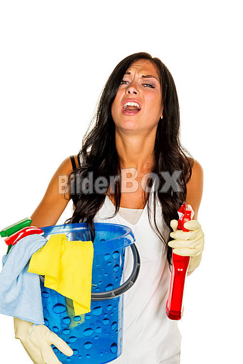 Beschreibung Eine junge Frau ärgert sich, dass sie den Hausputz machen muss.