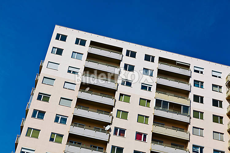 Beschreibung Ein Hochhaus als Wohnhaus mit Balkonen in einer Stadt