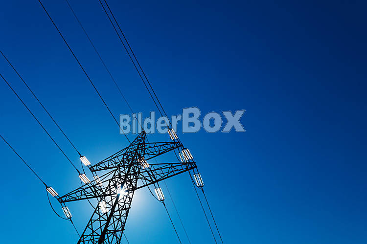 Beschreibung Hochspannungsmast, Symbolfoto für Stromproduktion, Versorgung und Stromnetz