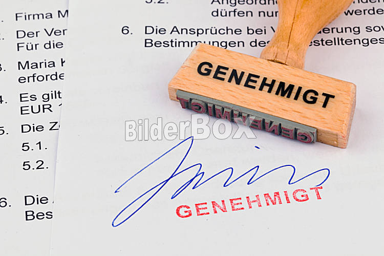 Beschreibung Ein Stempel aus Holz liegt auf einem Dokument. Aufschrift Genehmigt