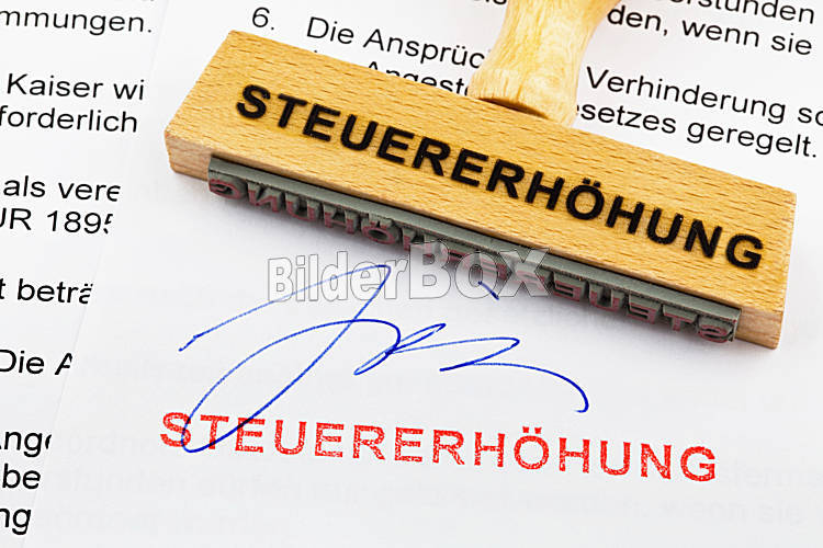 Beschreibung Ein Stempel aus Holz liegt auf einem Dokument. Deutsche Aufschrift: Steuererhöhung