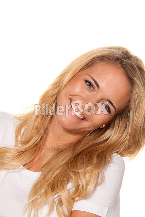 Beschreibung Junge nette Frau. Fröhlich lächelnd. Portrait vor weißem Hintergrund