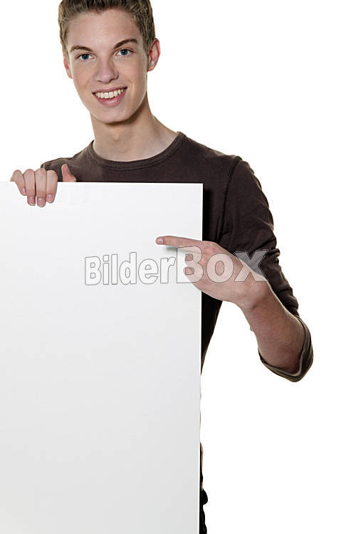 Beschreibung Ein junger Mann mikt leerem Plakat für Ankündigung