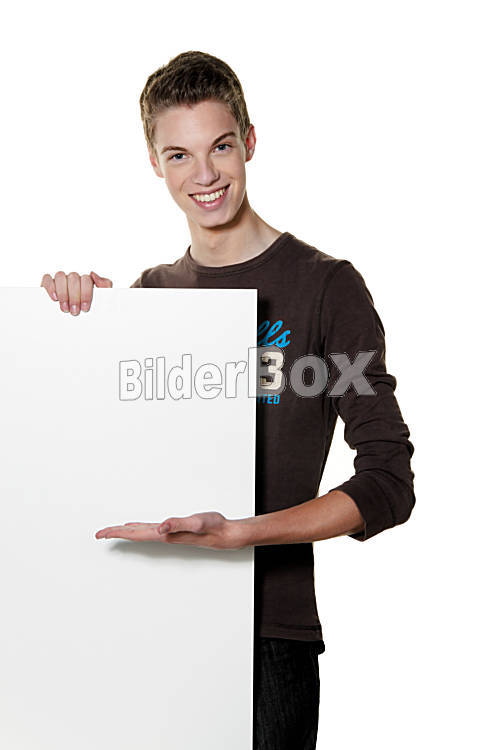 Beschreibung Ein junger Mann mikt leerem Plakat für Ankündigung