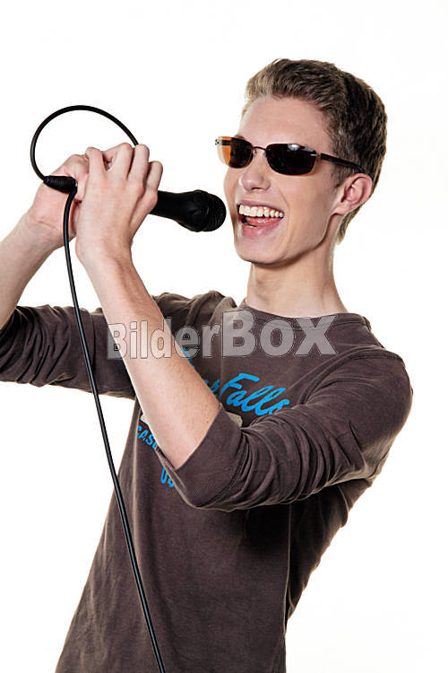 Beschreibung Ein junger Sänger mit Mikrofon bei einem Auftritt