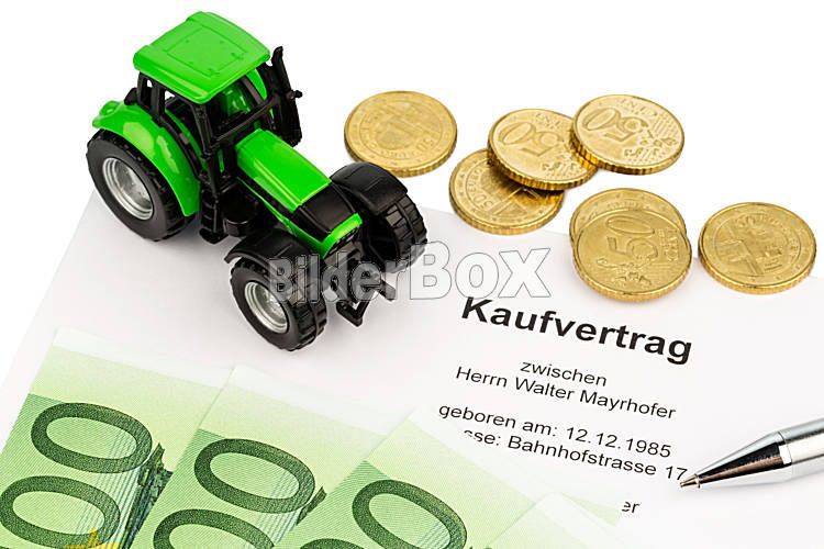Beschreibung Der Kaufvertrag für einen neuen Traktor bei einem Autohändler. Mit Eurobanknoten..
