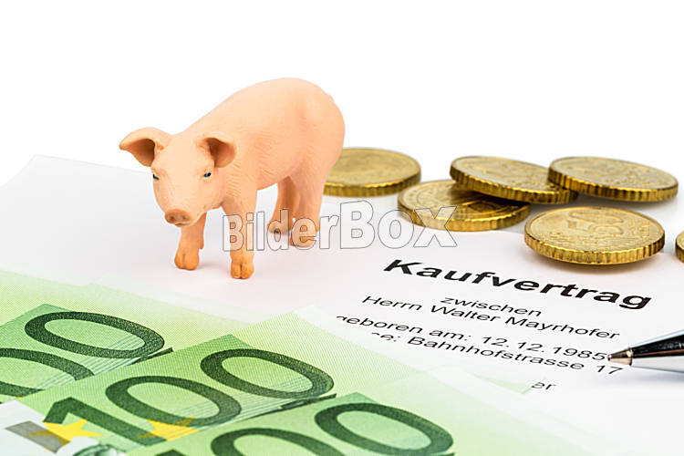 Beschreibung Ein Kaufvertrag und ein Schwein. Kauf von landwirtshaftlichen Nutztieren.