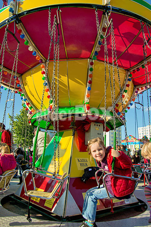 Beschreibung Kind fährt auf einem Jahrmarkt mit einem Kettenkarussell und hat Spaß