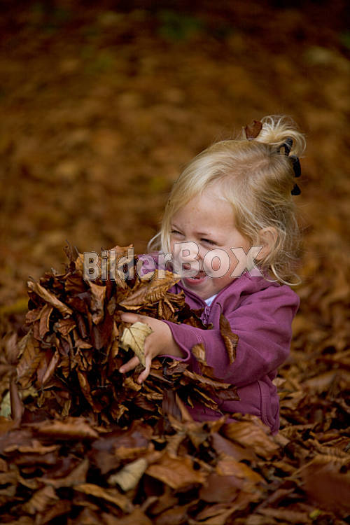 Beschreibung Kind mit Blättern eines baumes im Herbst