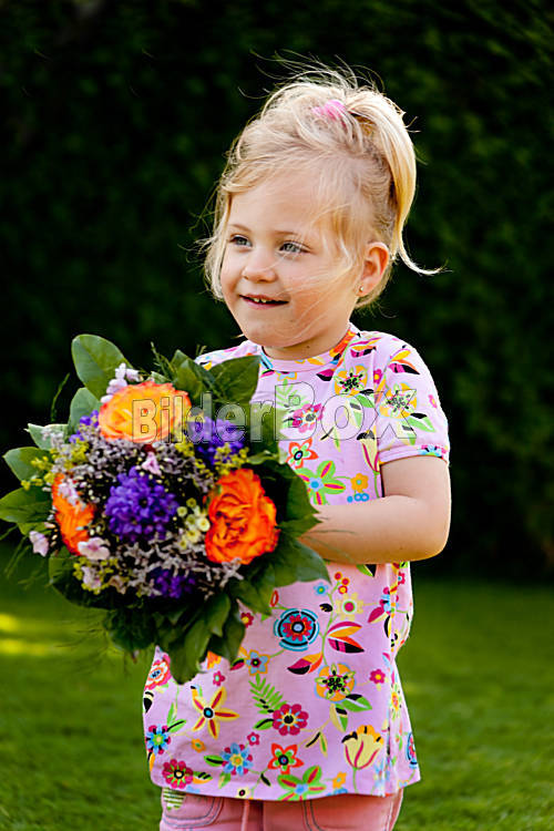 Beschreibung Kleines Kind mit Blumenstrauß. Geschenk für Muttertag
