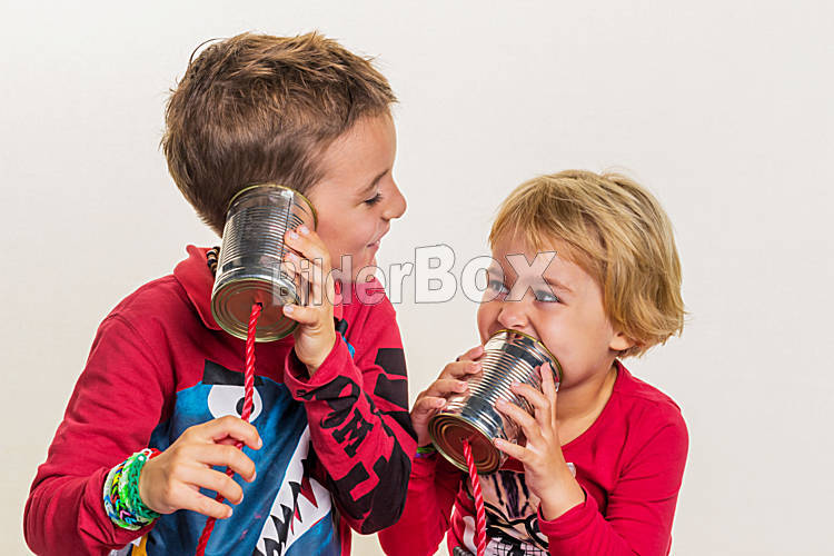 Beschreibung Zwei kleine Kinder telefonieren mit einem Telefon aus zwei Dosen.