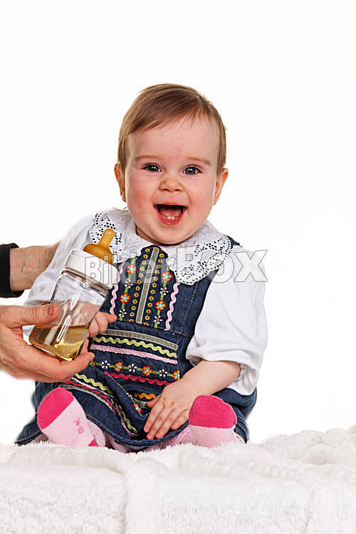 Beschreibung Kleines fröhliches Kind - Baby sitzt auf einer Decke
