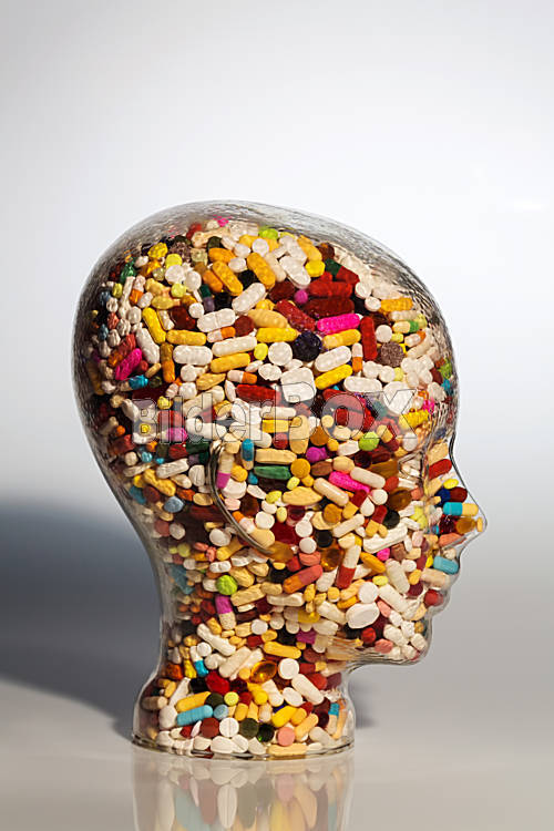 Beschreibung Ein Kopf aus Glas mit vielen Tabletten gefüllt. Symbolphoto für Medikamente, Mißbrauch und Tablettensucht.