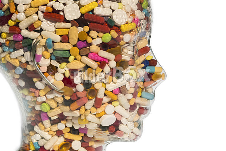 Beschreibung Ein Kopf aus Glas mit vielen Tabletten gefüllt. Symbolphoto für Medikamente, Mißbrauch und Tablettensucht.