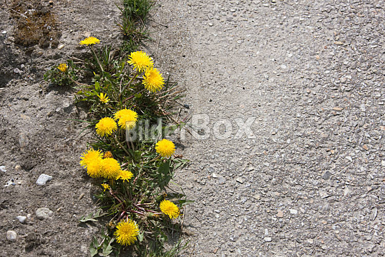 Beschreibung Löwenzahn wächst aus Asphalt [ (c) www.BilderBox.com, Erwin Wodicka, Siedlerzeile 3, A-4062 Thening, Tel. + 43 676 5103678.Verwendung nur gegen HONORAR, BELEG, URHEBERVERMERK nach AGBs auf...