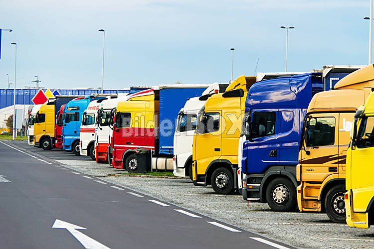 Beschreibung Viele verschiedene LKWs parken auf einem Parkplatz der Autobahn