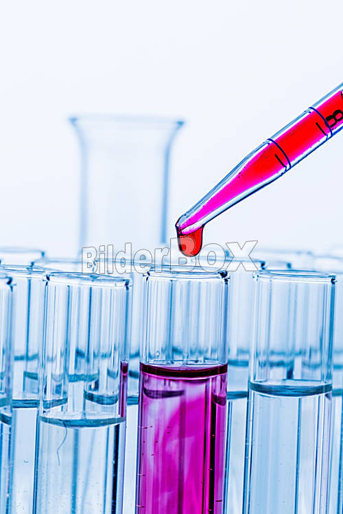 Beschreibung Viele Reagenzgläser bei einem Versuch in einem Forschungslabor einer Universität. Symbolfoto für lernen und forschen.