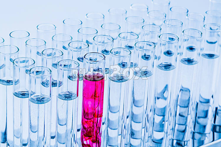 Beschreibung Viele Reagenzgläser bei einem Versuch in einem Forschungslabor einer Universität. Symbolfoto für lernen und forschen.