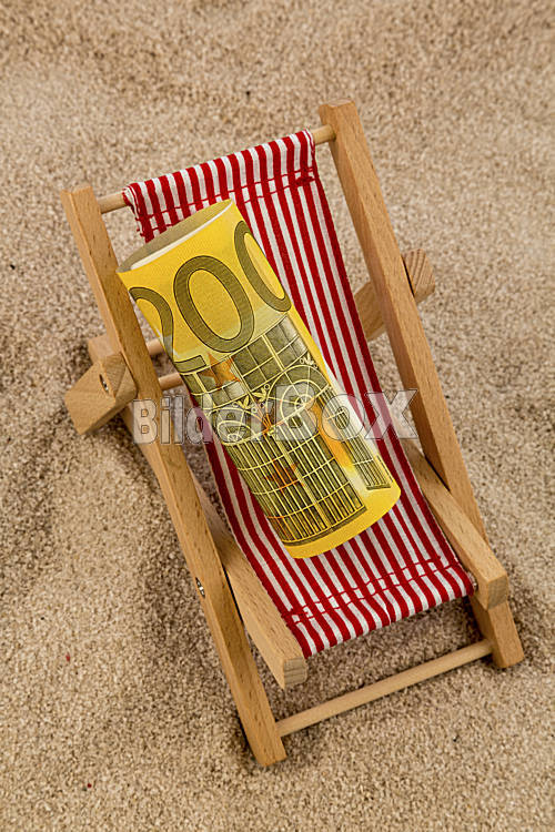 Beschreibung Ein Liegestuhl mit einem Euro Geldschein. Symbolfoto für sparen im Urlaub und bei Reisen