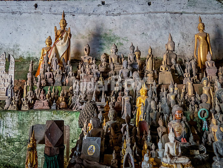 Beschreibung Luang Prabang, Laos - November 19, 2018: Buddah's in den Pak Ou Höhlen. Hier stehen mehrere tausend Buddha Figuren aus den unterschiedlichsten Epochen. Bedeutender buddhistischer Wallfahrtsort...