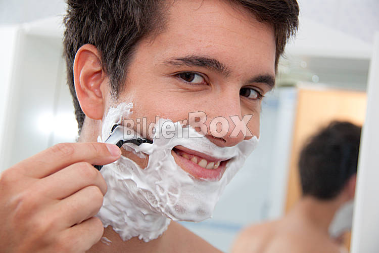 Beschreibung Junger Mann rasiert sich mit Rasierklinge Und Rasierschaum im Badezimmer, Young man shaving with razor and shaving cream in bathroom