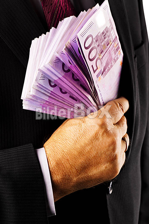 Beschreibung Ein Manager mit vielen 500 Eurogeld Scheinen in der Hand.