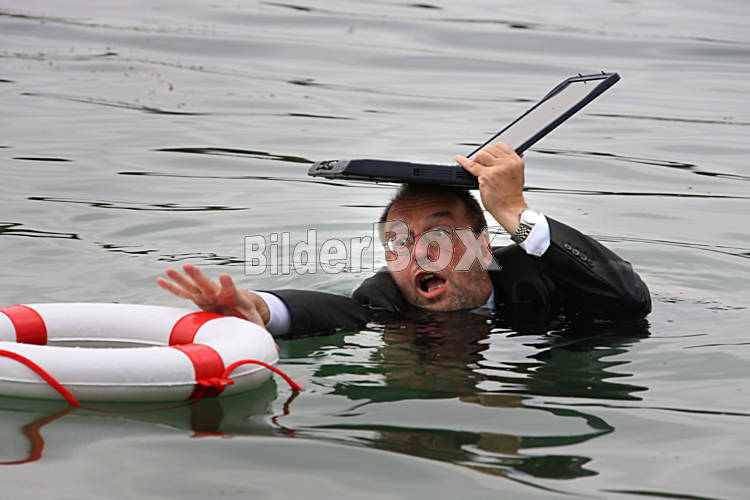 Beschreibung Manager steht Wasser bis zum Hals [ (c) www.BilderBox.com, Erwin Wodicka, Siedlerzeile 3, A-4062 Thening, Tel. + 43 676 5103678.Verwendung nur gegen HONORAR, BELEG, URHEBERVERMERK nach AGBs auf...
