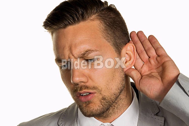 Beschreibung Ein Mann ( Unternehmer oder Manager ) hält seine Hand an sein Ohr