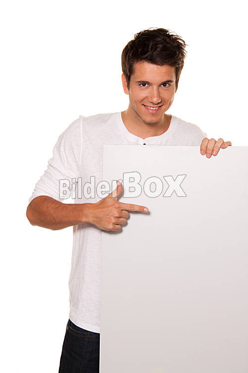 Beschreibung Junger Mann mit leerem Poster zur Werbung für Eröffnung und Angeboten