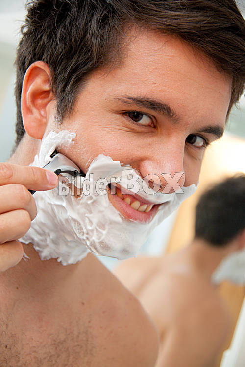 Beschreibung Junger Mann rasiert sich mit Rasierklinge Und Rasierschaum im Badezimmer