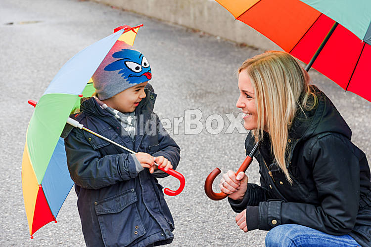 Beschreibung Mutter und Kind mit Regenschirm, Symbol für Solidarität, Hilfe, Hilfspaket, Rettungsschirm,