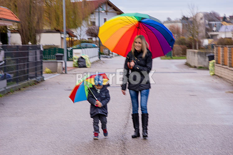 Beschreibung Mutter und Kind mit Regenschirm, Symbol für Solidarität, Hilfe, Hilfspaket, Rettungsschirm
