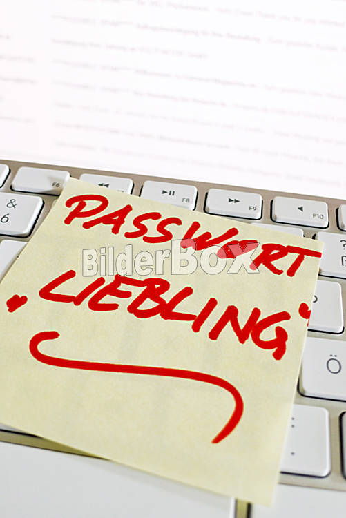 Beschreibung Ein Notizzettel liegt auf der Tastatur eines Computers zur Erinnerung: Passwort Liebling