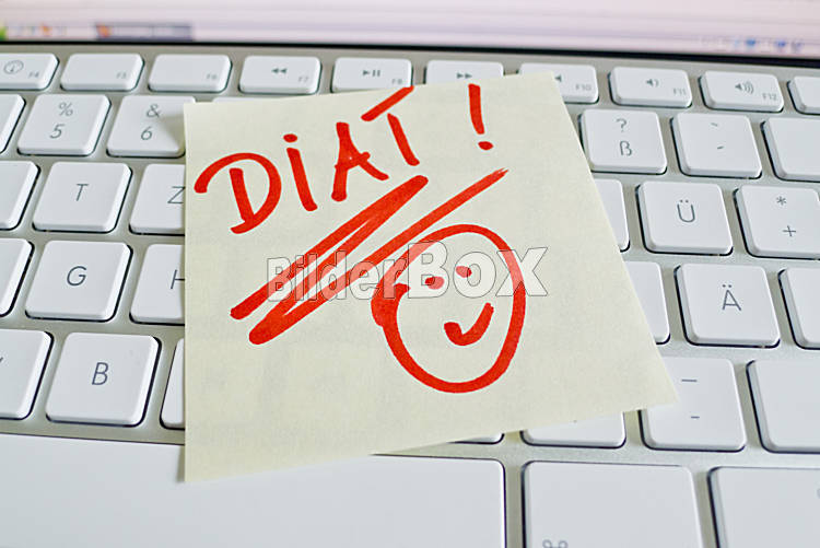 Beschreibung Ein Notizzettel liegt auf der Tastatur eines Computers zur Erinnerung: Diät